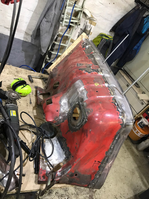 Zusätzlich war noch das Blech hinter dem Kühlwasserausgleichsbehälter und das dahinterliegende Verstärkungsblech angefressen. Das habe ich angefertigt, eingeschweißt und verschliffen - fast nichts von zu sehen